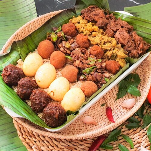 Your favourite Lamprai is made of rice cooked in ghee and stock served with a cubed chicken curry, boiled and fried egg, ash plantain, brinjal moju, frikkadel and prawn blachan. Now available in a pack so that you can share with your family and friends.