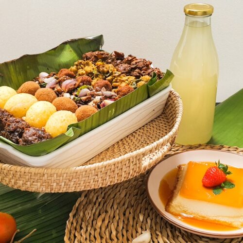 Your favourite Lamprai is made of rice cooked in ghee and stock served with a cubed chicken curry, boiled and fried egg, ash plantain, brinjal moju, frikkadel and prawn blachan. This pack comes with Cream Caramel and Lime drink. Now available in a pack so that you can share with your family and friends.