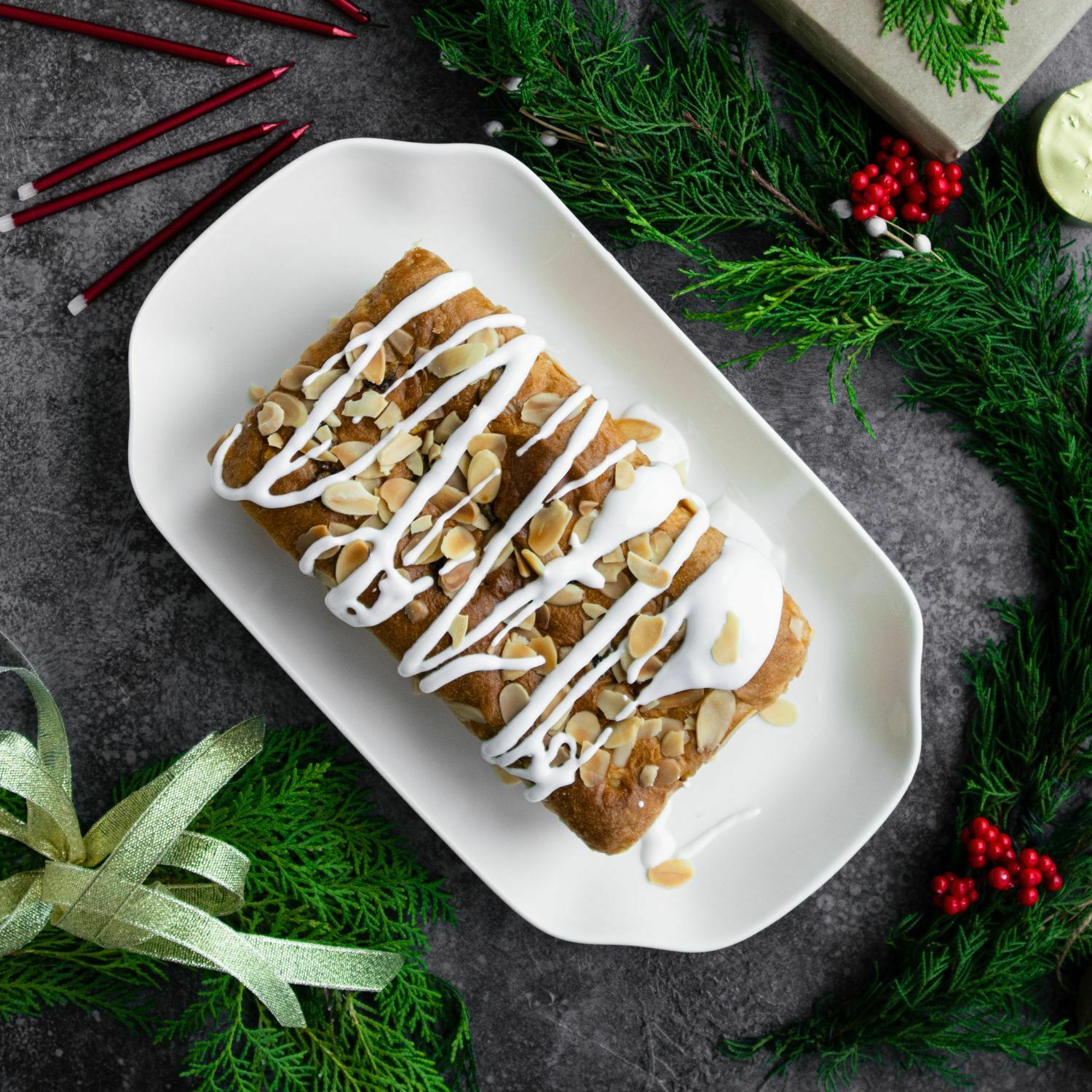 The Almond Christmas Stollen is an enriched sweet bread made with candied fruits centered with a marzipan roulade topped with vanilla fondant and almond flakes.