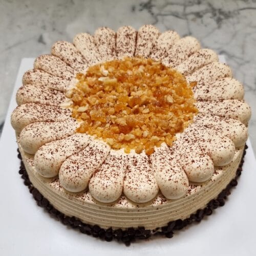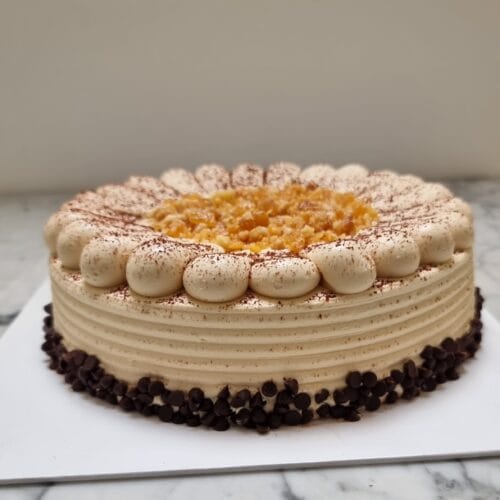 Soft and moist vanilla sponge with butterscotch flavoured whipped cream sandwiched between cake with nougat