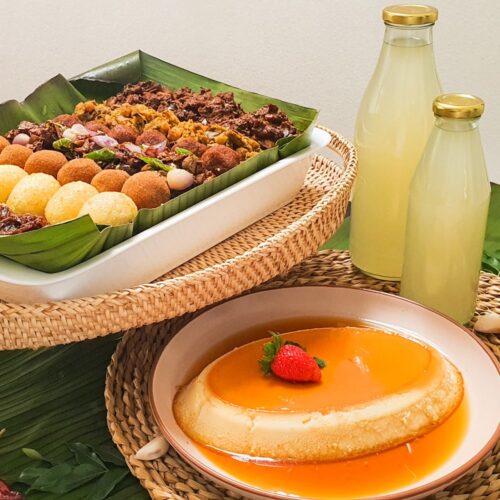 Your favourite Lamprai is made of rice cooked in ghee and stock served with a cubed chicken curry, boiled and fried egg, ash plantain, brinjal moju, frikkadel and prawn blachan. This pack comes with Cream Caramel and Lime drink. Now available in a pack so that you can share with your family and friends.