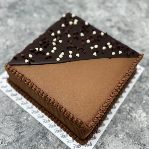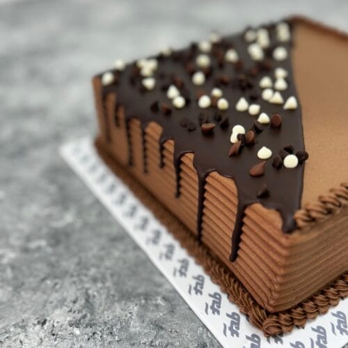 Soft butter cake with dark chocolate chips sandwiched and covered in chocolate butter icing.