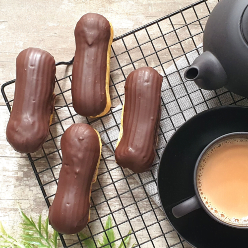 Crisp and puffy choux bun with chocolate icing filling and chocolate fondant on top