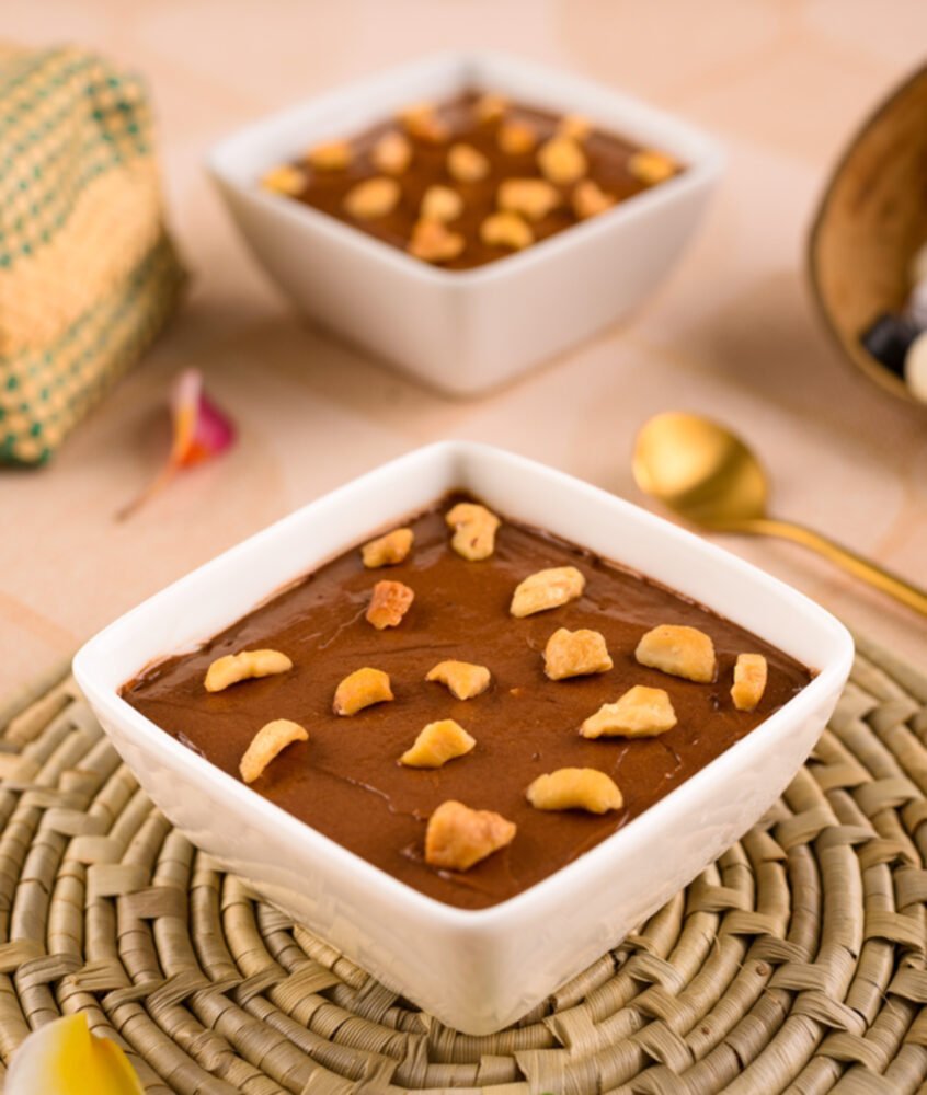 Much like chocolate biscuit pudding but made with crushed meringue and a light rich chocolate cream topped with nuts