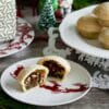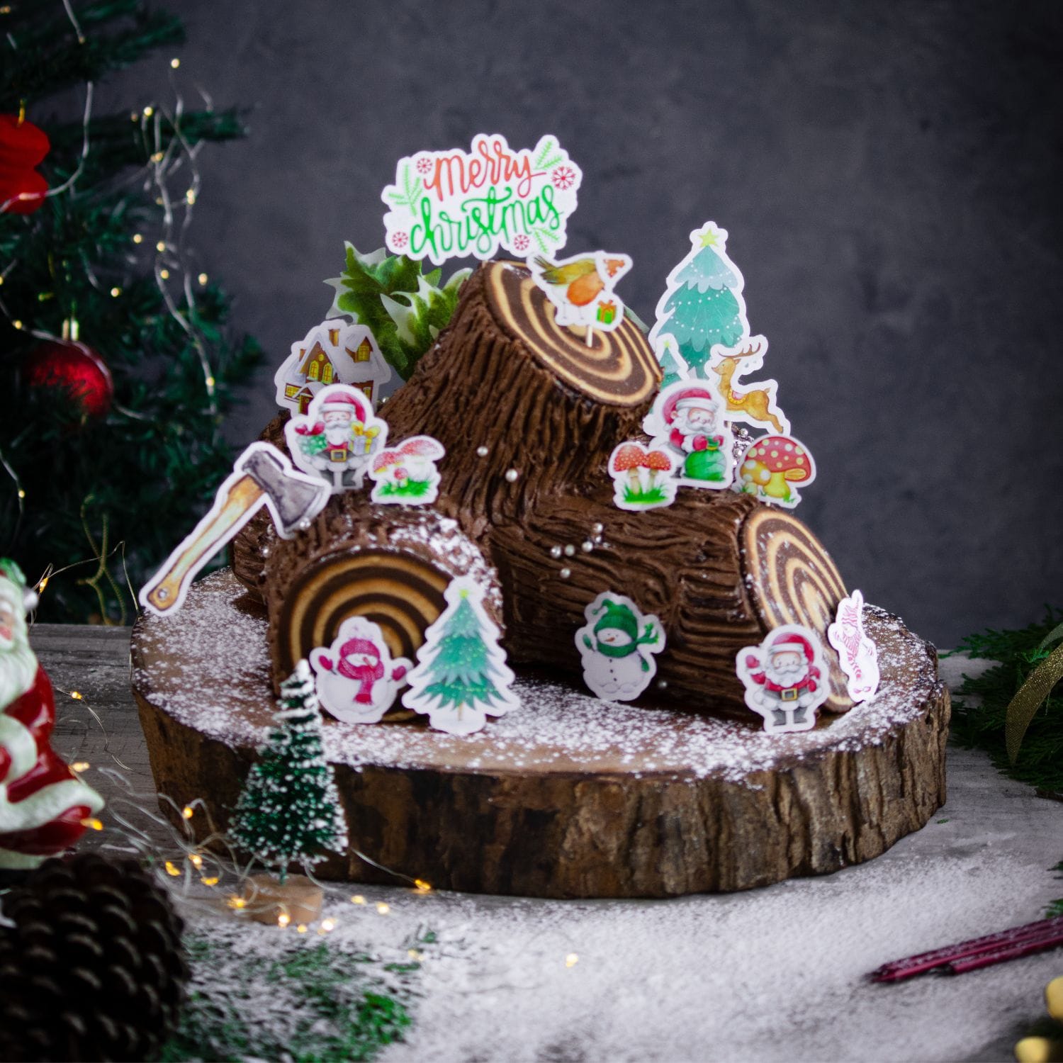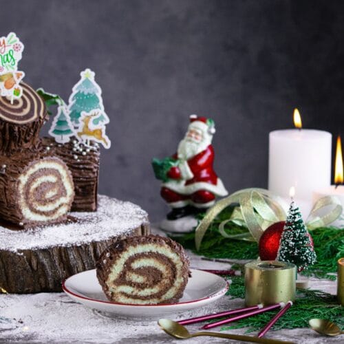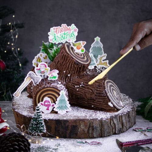 The chocolate Yule Log is a vanilla sponge cake filled with rich chocolate butter icing, rolled and styled into a yule type log and decorated with Christmas ornaments and topped with sugar snow.