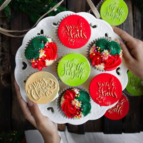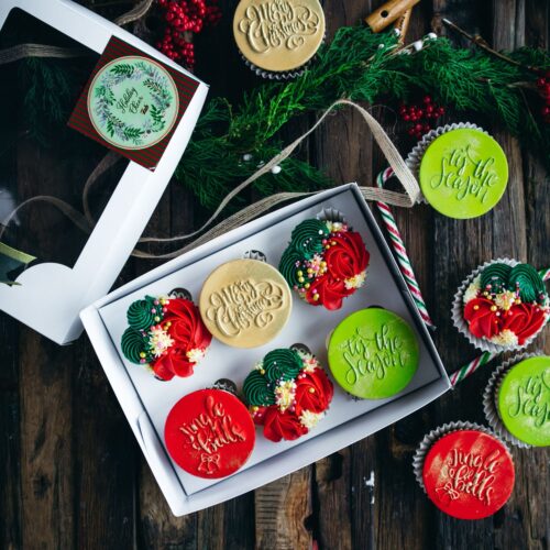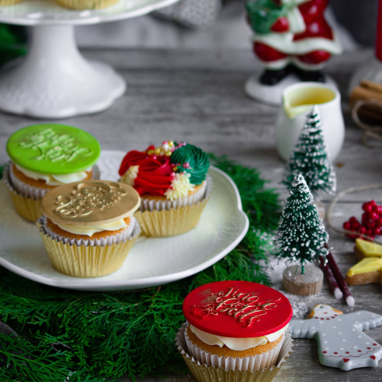 6 delicious vanilla cupcakes topped with Christmas elements.