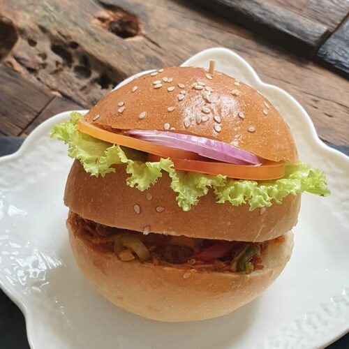 A soft fresh bun with shredded & devilled chicken filling and tomato, onions and lettuce.