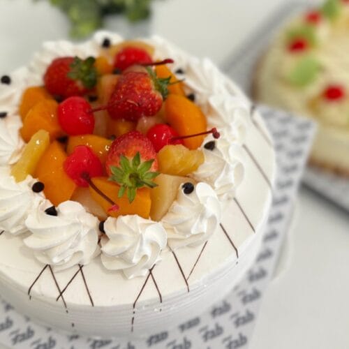 A gateau layered with pineapple custard and orange flavoured whipped cream filling and a vibrant and colorful fruit topping.