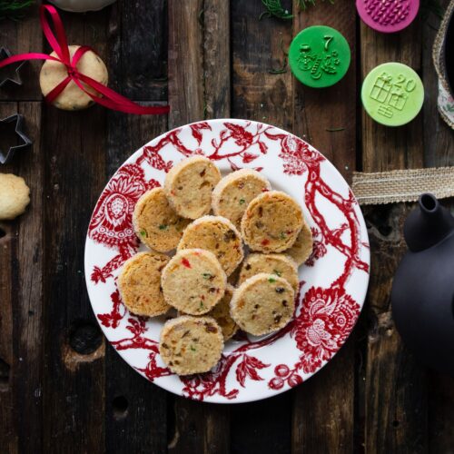 Fruit sable cookies have a rich buttery taste and is made with cashew nuts and dried fruits and piced with seasonal spices and is a colorful seasonal serving