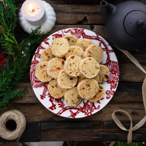 Fruit sable cookies have a rich buttery taste and is made with cashew nuts and dried fruits and piced with seasonal spices and is a colorful seasonal serving