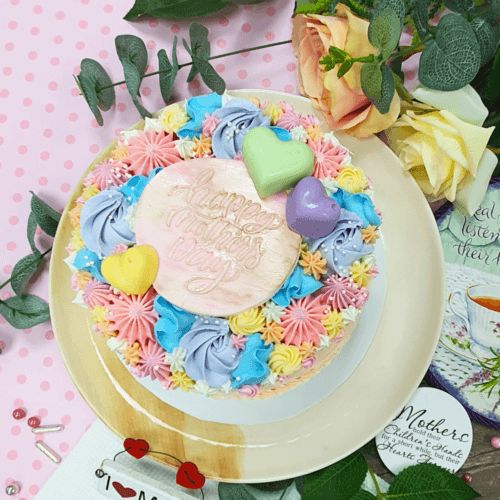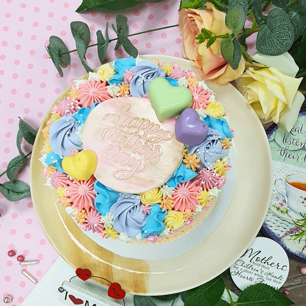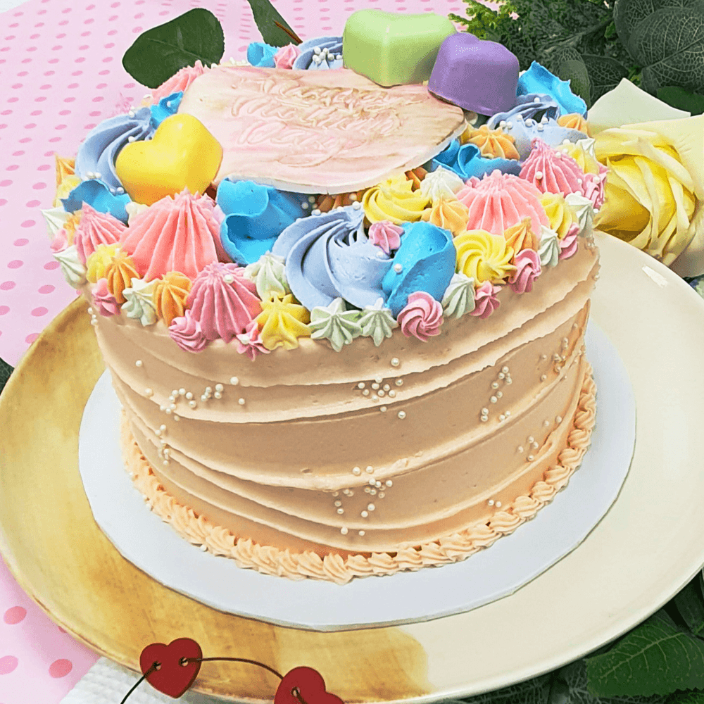 Coloured layers of soft butter cake with vanilla icing and strawberry jam filling and covered in vanilla butter icing