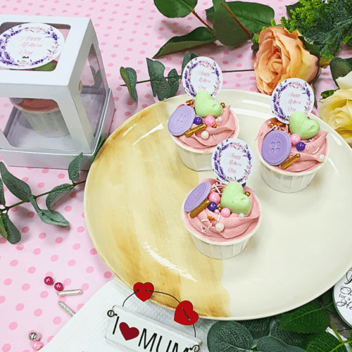 Fluffy vanilla cupcakes with vanilla butter icing decorated with Mother’s Day elements.