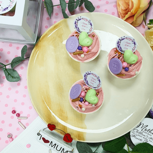 Fluffy vanilla cupcakes with vanilla butter icing decorated with Mother’s Day elements.