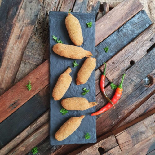 Mutton filling stuffed into a capsicum, covered in breadcrumbs and deep fried