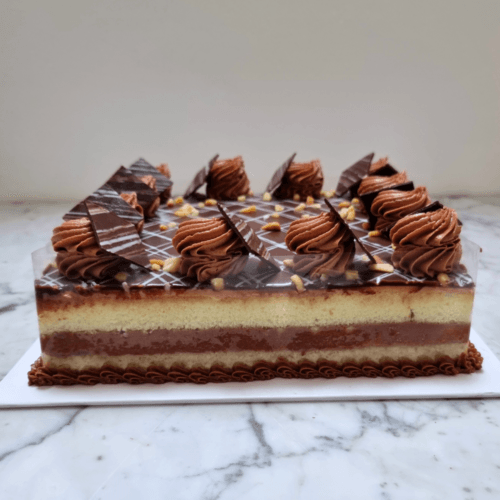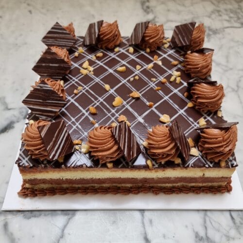 Layers of vanilla sponge sheets layered with chocolate butter icing and roasted nuts topped with a rich chocolate fudge.