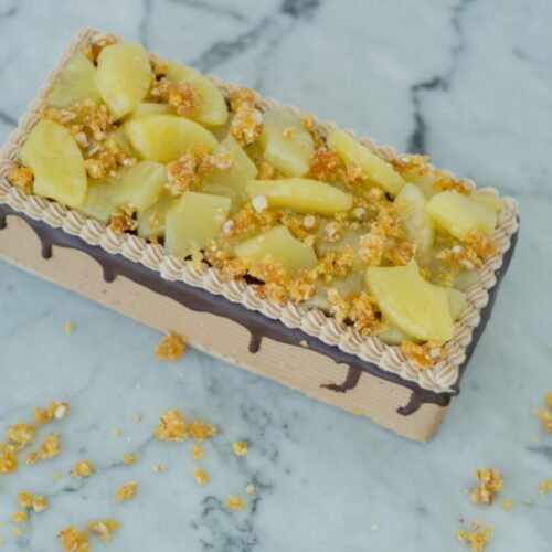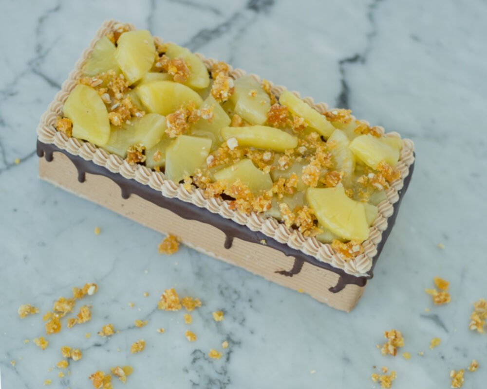 A chocolate cake with chocolate cream and pineapple custard topped with pineapple and nougat