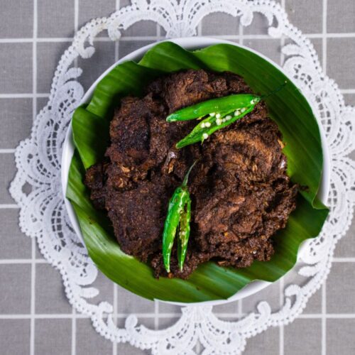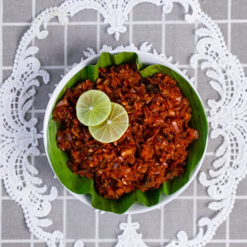 Katta sambol is a spicy condiment made of ground dried chillies, onions and maldivian fish and goes hand in hand with Kiribath.