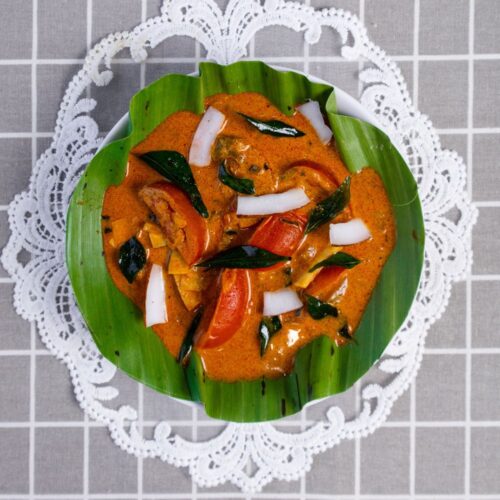 Tomato & Young Coconut Curry is made using tomatoes cooked in coconut milk with ground spices and young coconut to make it an aromatic curry