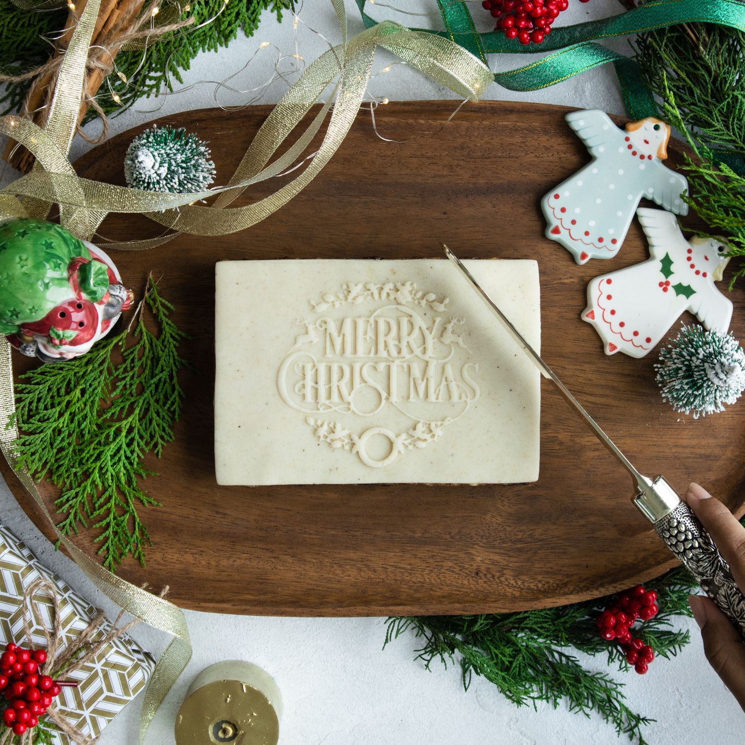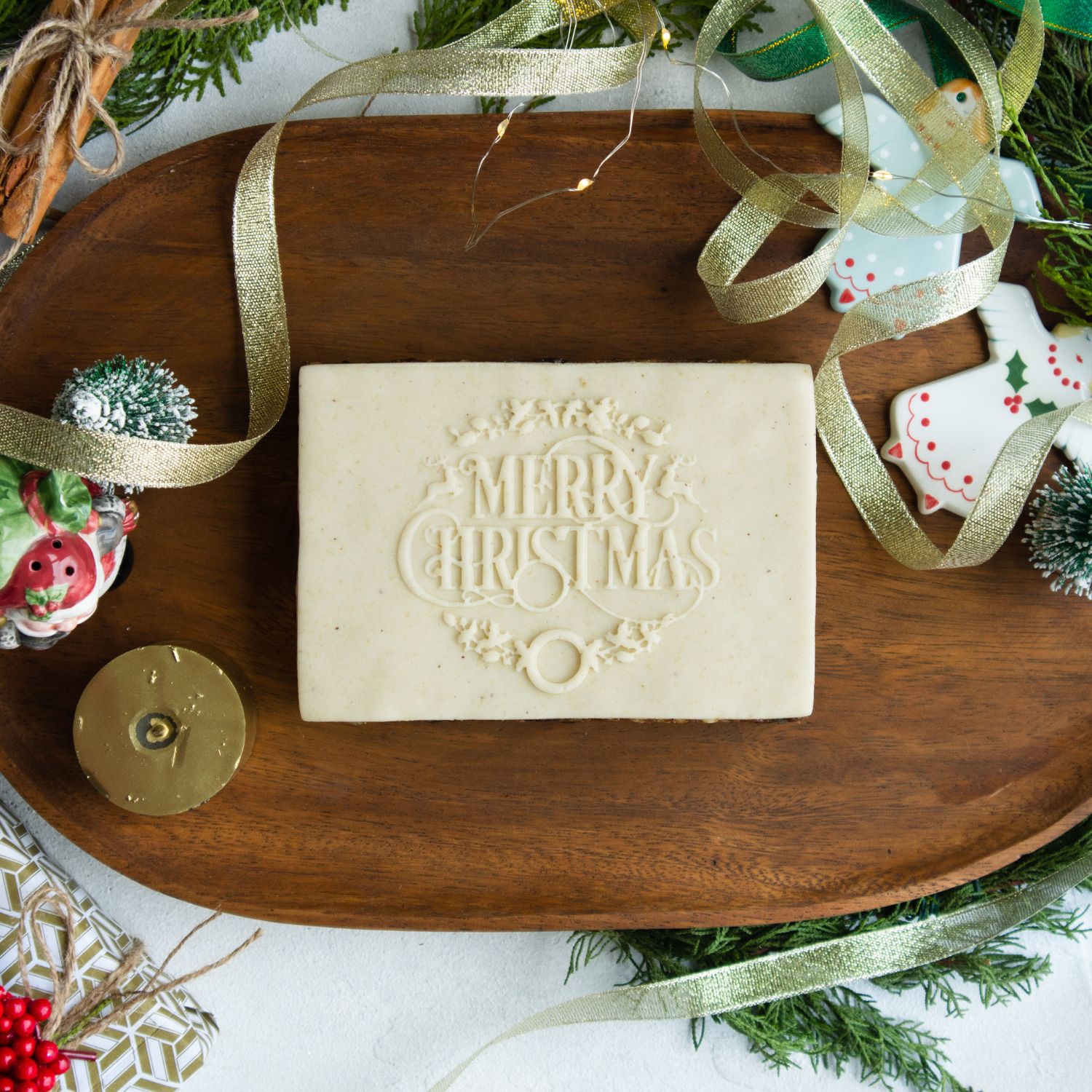 500g Rich cake with an almond paste topping with an embossed Christmas Greeting.